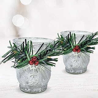 Christmas Candle Holders - Set of 2 - Red Berries and Garland Wrap White Glittery Candle Holders - 2 Flameless Votive Candles Included - Christmas Decorations - Christmas Centrepieces