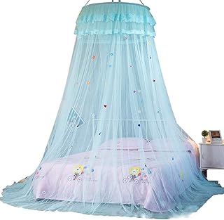 ENMNM 蚊帳 天蓋カーテン モスキートネット お姫様気分 オシャレ 円柱形 吊り下げ かや フック付き プリンセス ベッド インテリア かわいい レース快適な安眠へ 取り付け簡単 (ブルー)
