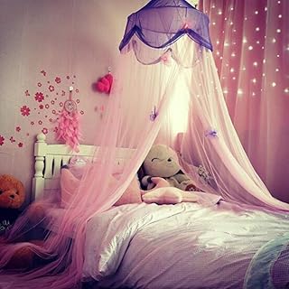 ENMNM 蚊帳 天蓋カーテン モスキートネット お姫様気分 オシャレ 円柱形 吊り下げ かや フック付き プリンセス ベッド インテリア かわいい レース 快適な安眠へ 取り付け簡単 (ピンク+パープル)