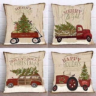 ファームハウス クリスマス 装飾用クッションカバー クリスマス トラック クリスマスツリーテーマ 枕カバー クリスマス ホリデー インテリア ホーム 車 寝具 クッションカバー コットンリネン 18x18インチ 4個セット